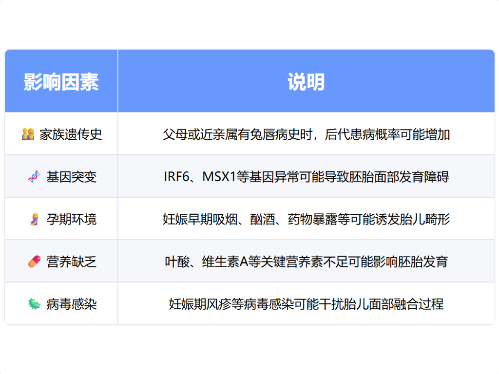 兔唇可能会遗传给下一代,但并非绝对。兔唇的遗传概率受家族遗传史、孕期环境因素、基因突变等多重因素影响。