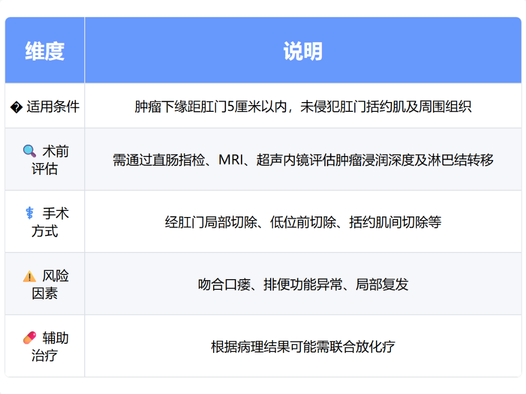 经肛门局部切除术适用于T1期肿瘤,通过肛门直接切除病灶。低位前切除术需游离直肠至肛提肌水平,使用吻合器完成结肠肛管吻合。括约肌间切除术可保留部分内括约肌,适用于超低位肿瘤。部分病例需临时性造口保护吻合口。