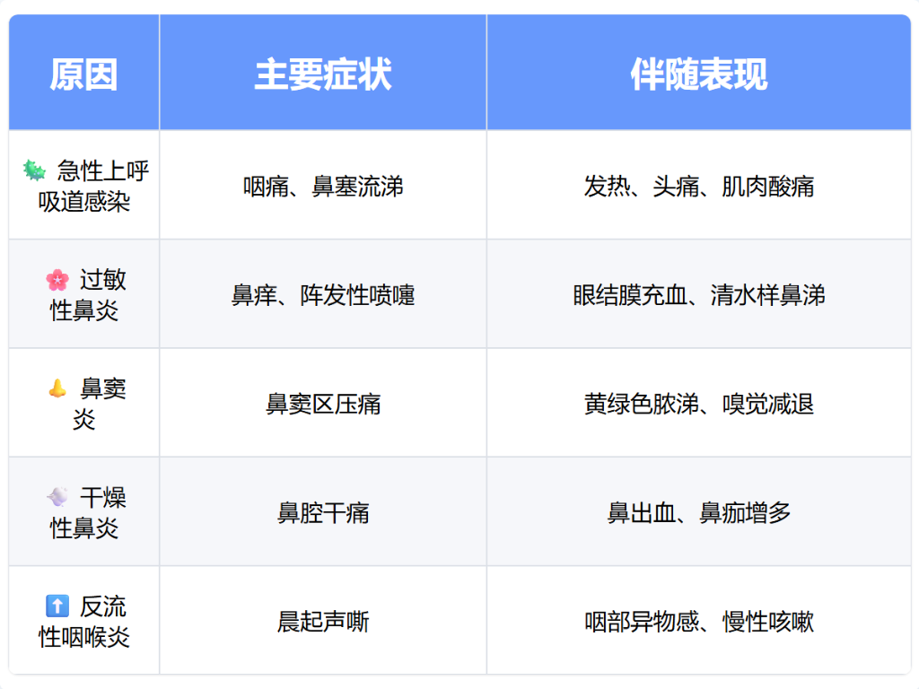 喉咙痛鼻子疼可能由急性上呼吸道感染、过敏性鼻炎、鼻窦炎、干燥性鼻炎、反流性咽喉炎等原因引起。这些症状通常表现为咽部灼热感、鼻塞、流涕、鼻腔干燥或胃酸反流刺激等。