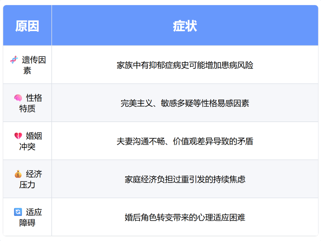 婚后抑郁症可能由遗传因素、性格特质、婚姻冲突、经济压力、适应障碍等原因引起。婚后抑郁症通常表现为情绪低落、兴趣减退、睡眠障碍、食欲改变、自我否定等症状。