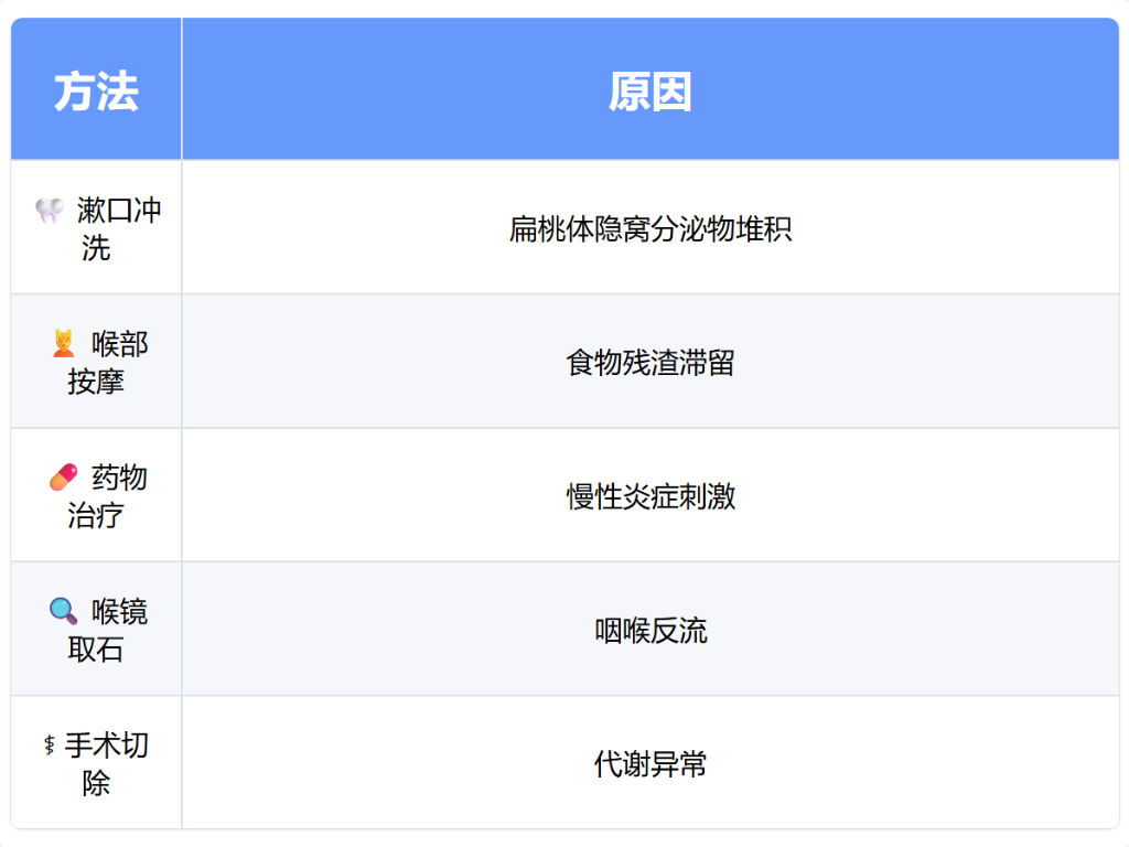 喉咙结石可通过漱口冲洗、喉部按摩、药物治疗、喉镜取石、手术切除等方式治疗。喉咙结石通常由扁桃体隐窝分泌物堆积、慢性炎症刺激、食物残渣滞留、咽喉反流、代谢异常等原因引起。
